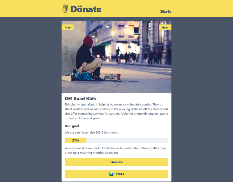 Help Berlin, Dönate a Döner! Simple web app built with React (incl. Hooks, Context API and reducers to handle state) and Stripe Checkout API to funnel donations to local Berlin charities. Offers one-time or subscription payments.